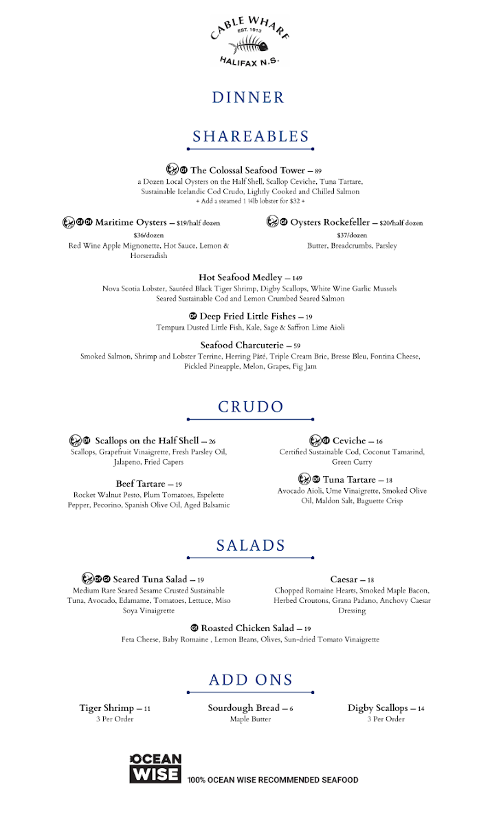 Nestled along the scenic waterfront of Halifax, The Cable Wharf offers a vibrant culinary escape. Here, the menu features a remarkable array of dishes that celebrate fresh, local ingredients with an innovative twist. Begin with exquisite Crudo options like the Scallops on the Half Shell, accompanied by a zesty grapefruit vinaigrette. The Tuna Tartare shines with its creamy avocado aioli and umami-rich smoked olive oil. For a heartier touch, the Colossal Sea Tower is a must-try, featuring a delightful mix of seafood, crowned with succulent steamed lobster.
